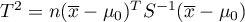 $T^2 = n(\overline{x}-\mu_0)^TS^{-1}(\overline{x}-\mu_0)$ - pierwotna statystyka testowa Hotellinga o rozkładzie $\chi^2$ (zalecana dla prób o dużych licznościach),