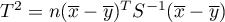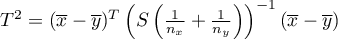 $T^2 = (\overline{x}-\overline{y})^T\left(S\left(\frac{1}{n_x}+\frac{1}{n_y}\right)\right)^{-1}(\overline{x}-\overline{y})$ - pierwotna statystyka testowa Hotellinga o rozkładzie $\chi^2$ (zalecana dla prób o dużych licznościach),